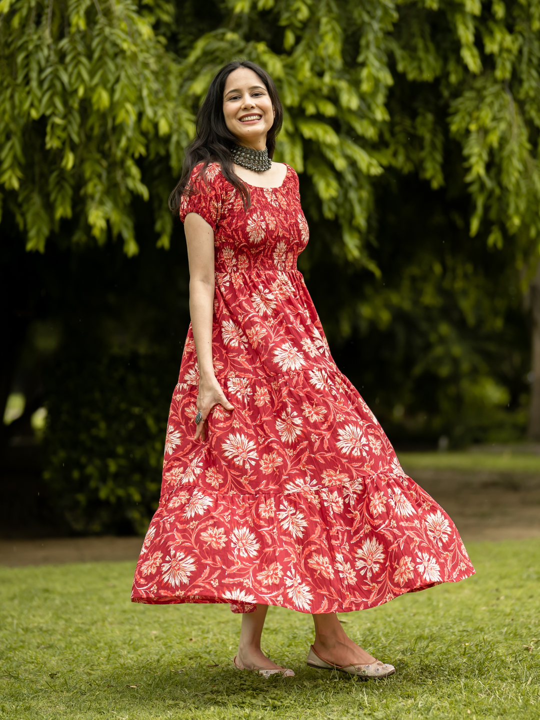 RED COTTON OFF-SHOULDER TIERED DRESS