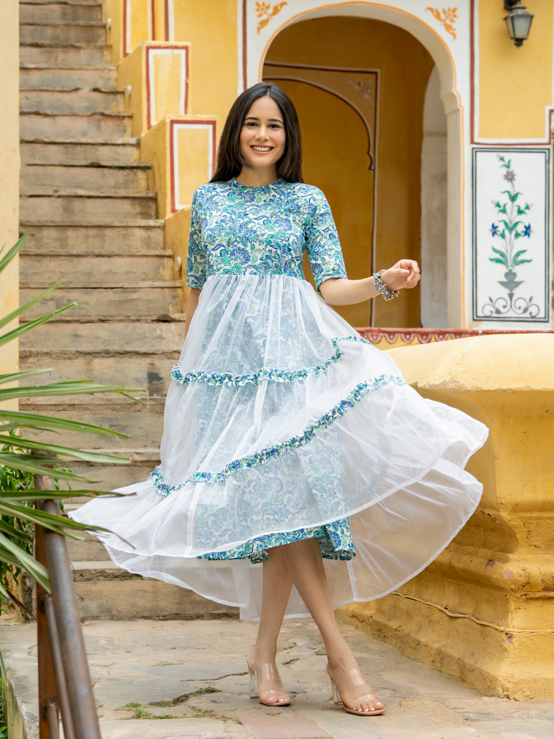 BLUE ORGANZA TIERED DRESS