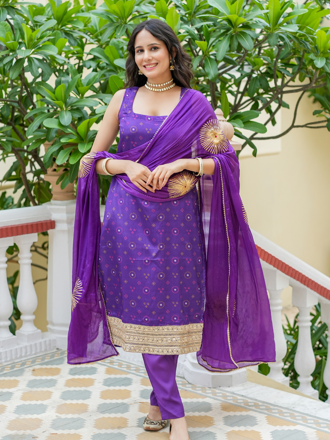 PURPLE LEHERIYA EMBELLISHED KURTA SET