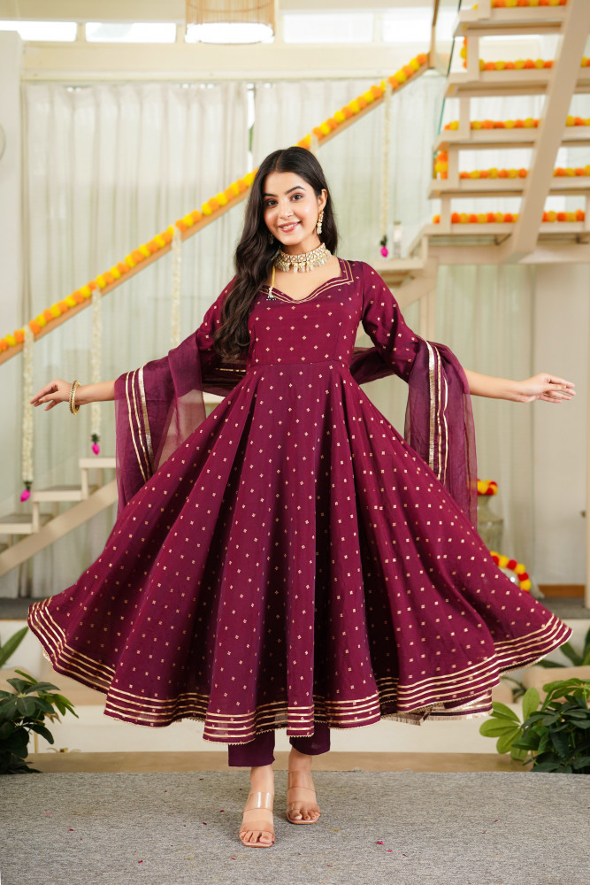 This Wine suit set features a flared anarkali crafted with exotic Gota lace work & gold print, a solid pant with elasticated waistband and a solid dupatta with lace work on border.